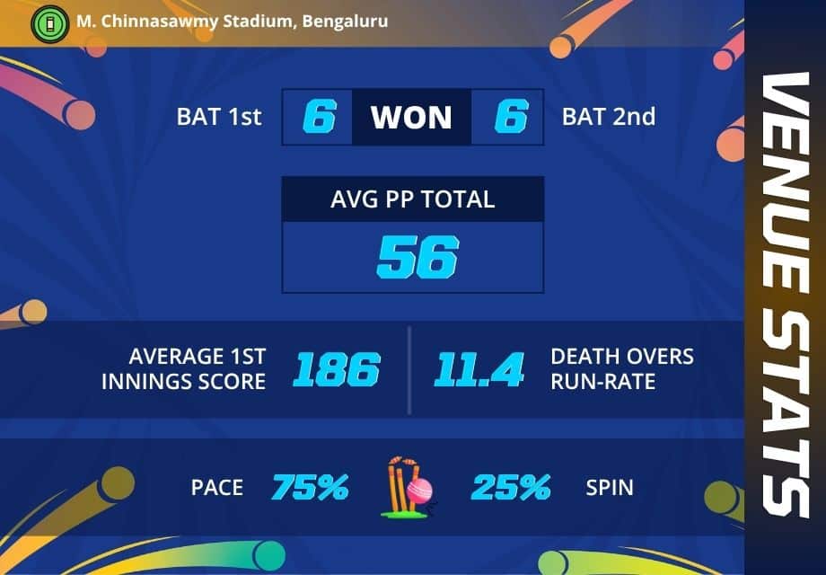 एम. चिन्नास्वामी स्टेडियम एक संतुलित, फिर भी विस्फोटक मैदान के तौर पर अपनी साख पर खरा उतर रहा है। पिछले दो सीज़न में, यहाँ 12 मैच खेले गए हैं, जिनमें पहले और दूसरे नंबर पर बैटिंग करने वाली टीमों ने बराबर, यानी 6-6 मैच जीते हैं। इससे यह साफ़ होता है कि टॉस जीतने का कोई खास फ़ायदा नहीं होता।